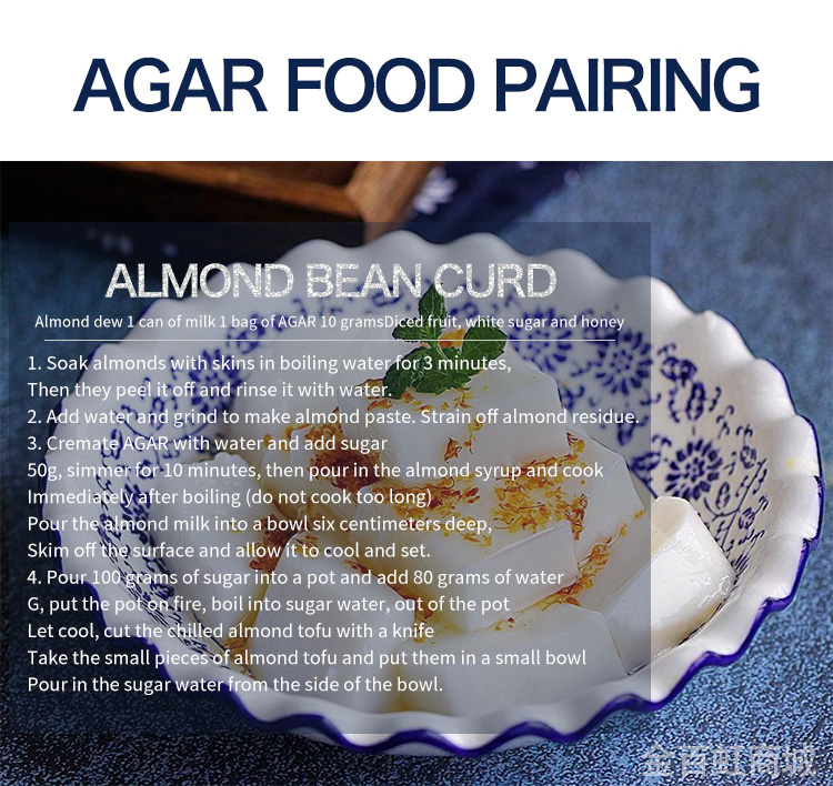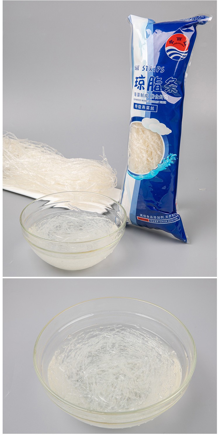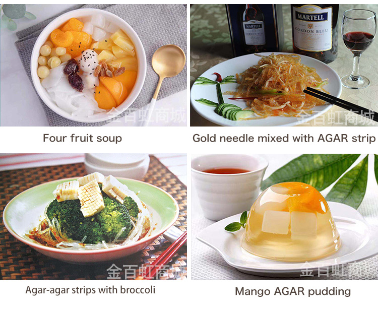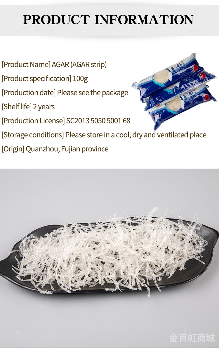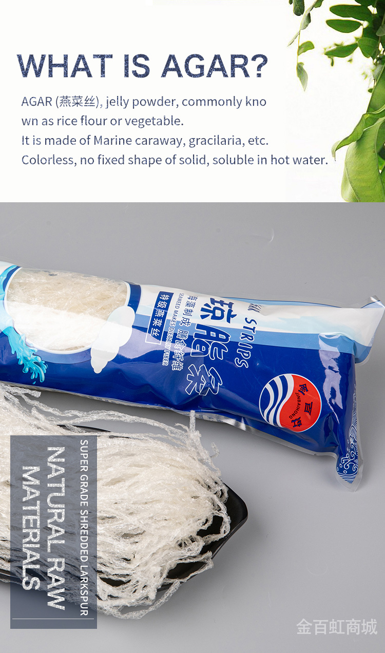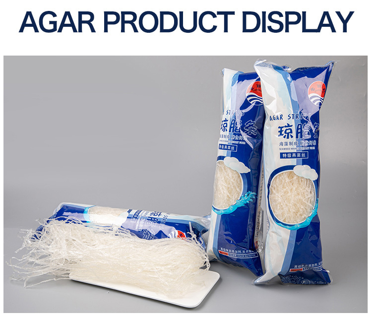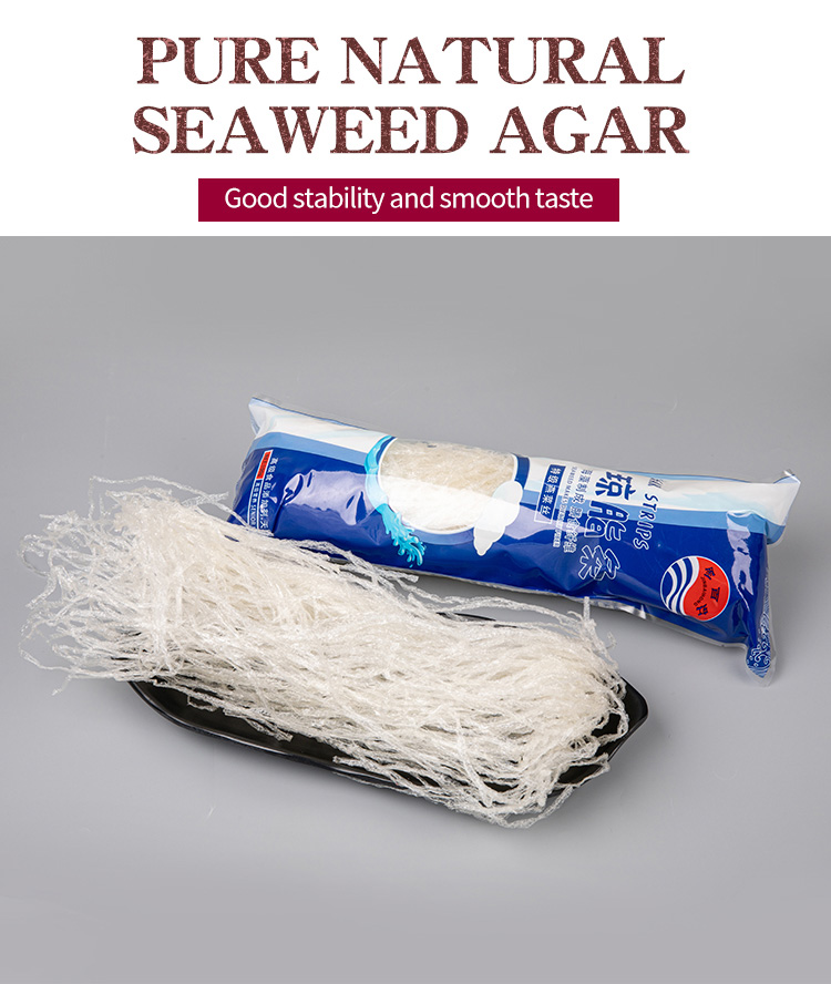 Food agar uses Indonesia and Chinese seaweeds as raw materials, which it is the natural substance extracted from seaweeds with scientic methods. The agar is one kind of hydrophilic collioids, which cannot dissovled in cool water but easily can be dissolved in boiled water and slowly dissolved in hot water.